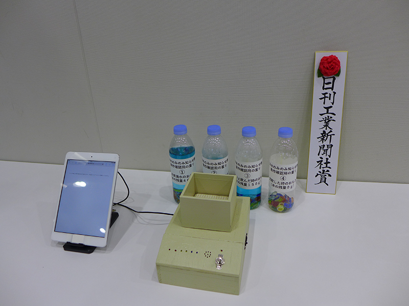 祖母の脳梗塞再発予防のため、こまめな水分補給を支援したいと思い、はかりとマイコンを組み込んだお知らせ機能付きの水筒置き場を作成しました。水筒の重さをはかり、時間に合わせて変化する目標値と水筒の重さの変化から、目標通りこまめに飲めているかがiPadの画面に表示されます。