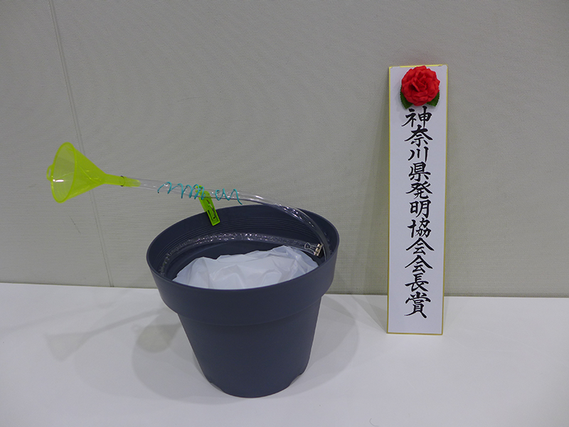 部屋をぬらさずに水やりができる装置です。じょうごに水を入れると、穴の開いたホースで水やりができます。